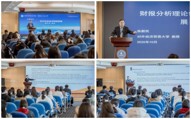 在主题报告环节,北京工商大学谢志华教授以《ESG与企业可持续发展》为题,从战略高度阐述了ESG对企业长期发展的核心价值;对外经济贸易大学张新民教授以《财报分析理论创新的新发展》为题,从方法论角度探讨了ESG背景下财务分析理论的演进路径;香港城市大学余扬新教授以《ESG研究的外延》为题,提出了ESG研究范式创新的重要方向;中央财经大学梁上坤教授以“Blood Ties and Employees' Protection: Evidence from Executives' Clan Culture”为题,展示了文化因素在公司治理中的实证研究成果。