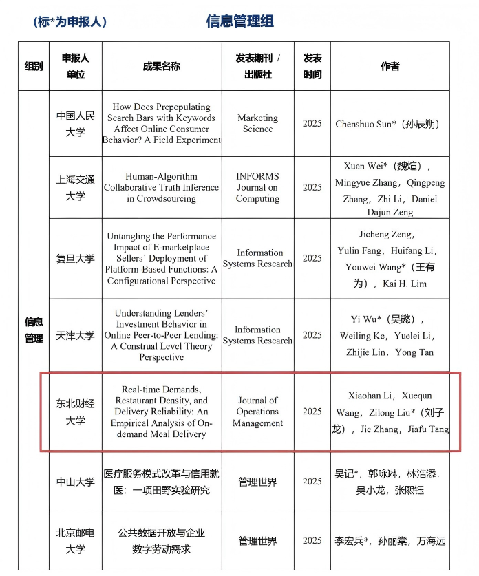 近日,中国信息经济学会公布了“2025年度中国信息经济学会创新论文奖”获奖名单。东北财经大学管理科学与工程学院刘子龙教授、唐加福教授及博士生李晓涵,与新墨西哥大学王学群教授、德州大学阿灵顿分校张洁教授合作发表于Journal of Operations Management(UTD24)的研究成果“Real-time Demands, Restaurant Density, and Delivery Reliability: An Empirical Analysis of On-demand Meal Delivery”荣获2025年中国信息经济学会创新论文奖(信息管理组)。