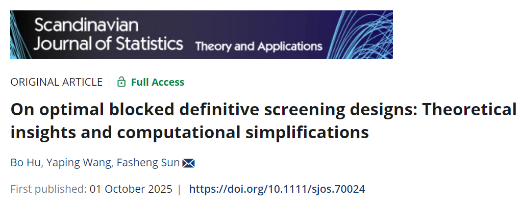 近日,东北财经大学统计学院胡波副教授与东北师范大学孙法省教授、华东师范大学王亚平教授合作的论文“On optimal blocked definitive screening designs: Theoretical insights and computational simplifications”被国际统计学权威期刊Scandinavian Journal of Statistics 接收并正式线上发表。