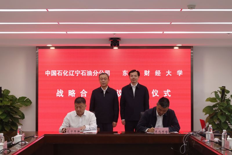 在习近平总书记主持召开新时代推动东北全面振兴座谈会并发表重要讲话一周年之际,为深入贯彻落实习近平总书记重要讲话精神,进一步对接新时代东北全面振兴国家战略需求,积极服务辽宁全面振兴新突破三年行动,9月26日,东北财经大学与中石化辽宁石油分公司在沈阳举行战略合作协议签约仪式。学校党委副书记、校长方红星,党委常委、副校长王伟同,中石化辽宁石油分公司党委书记李宁,党委副书记、总经理罗晓东,总会计师王培亮出席签约仪式。
