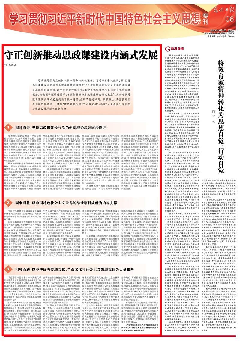 2024年12月3日,东北财经大学马克思主义学院院长王海威教授在《光明日报》06版“学习贯彻习近平新时代中国特色社会主义思想专刊”发表理论文章《守正创新推动思政课建设内涵式发展》。