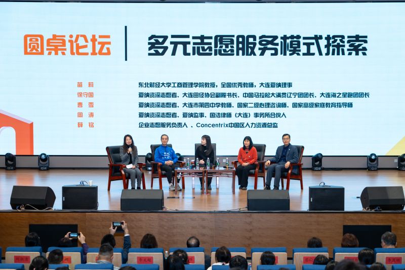 爱纳理事、东北财经大学工商管理学院教授、全国优秀教师苗莉,大连田径协会副秘书长、中国马拉松大满贯辽宁团团长、大连海之星跑团团长、爱纳心青年的“深海”团长徐守国,大连市第四中学教师、辽宁省优秀巾帼英雄志愿者曹雪,爱纳监事、国浩律师(大连)事务所合伙人周涛,Concentrix中国区人力资源总监薛铭以圆桌论坛的形式就“多元志愿服务模式探索”展开充分交流和研讨。他们结合自身志愿服务经历,围绕如何创新服务模式、精准匹配心智障碍者全生涯需求等话题畅所欲言,碰撞出诸多极具前瞻性与实操性的思想火花,为未来志愿服务的全面发展拓宽了思路。