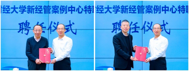 霍学喜和宋金波受聘为东北财经大学新经管案例中心特聘专家,汪旭晖颁发聘书。开幕式及主旨发言部分分别由东北财经大学投资工程管理学院院长吕丹和副院长王晓姝主持。