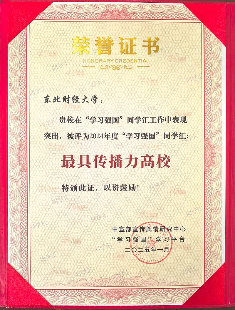 东北财经大学党委高度重视“学习强国”学习平台的推广使用工作,坚持将“学习强国”学习平台作为理论学习、素质提升、新闻宣传的重要载体和平台,引导全体师生员工深入学习宣传贯彻习近平新时代中国特色社会主义思想,党的二十大和二十届三中全会精神。在“学习强国”学习平台大力支持下,东北财经大学成为辽宁省首家开通学习强国号和辽宁省首批试点开通“同学汇”的高校。至今,东北财经大学学习强国号已发布700多篇图文和视频内容,“同学汇”订阅量已逾2万人,访问量超过69万人。2024年,东北财经大学“学习强国”同学汇依托东北财经大学学习强国号,持续做好运营工作,有28篇图文被“学习强国”全国平台和辽宁学习平台转载,8期上榜“同学汇”高校热度榜TOP50。下一步,学校将持续推进东北财经大学学习强国号和“同学汇”建设运营,努力打造讲好东财故事、传播东财声音的互动社区,为奋力谱写一流数字财经大学发展新篇章贡献力量。