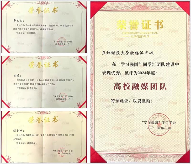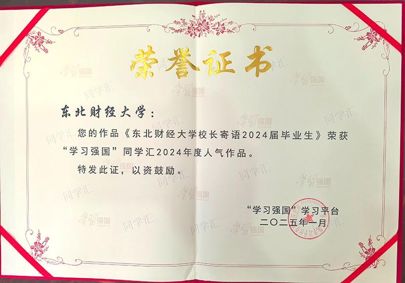 近日,“学习强国”学习平台公布了“学习强国”同学汇2024年度人气作品(高校)Top100、2024年度人气作品(个人)Top100、2024年度高校融媒团队Top50名单。东北财经大学被中宣部宣传舆情研究中心、“学习强国”学习平台授予“最具传播力高校”荣誉称号,新闻作品《东北财经大学校长寄语2024届毕业生》获评2024年度人气作品(高校)Top100,党委宣传部郭立文、王萱和融媒体中心学生记者刘雪冰的3篇作品获评2024年度人气作品(个人)Top100,东北财经大学融媒体中心获评2024年度高校融媒团队Top50。