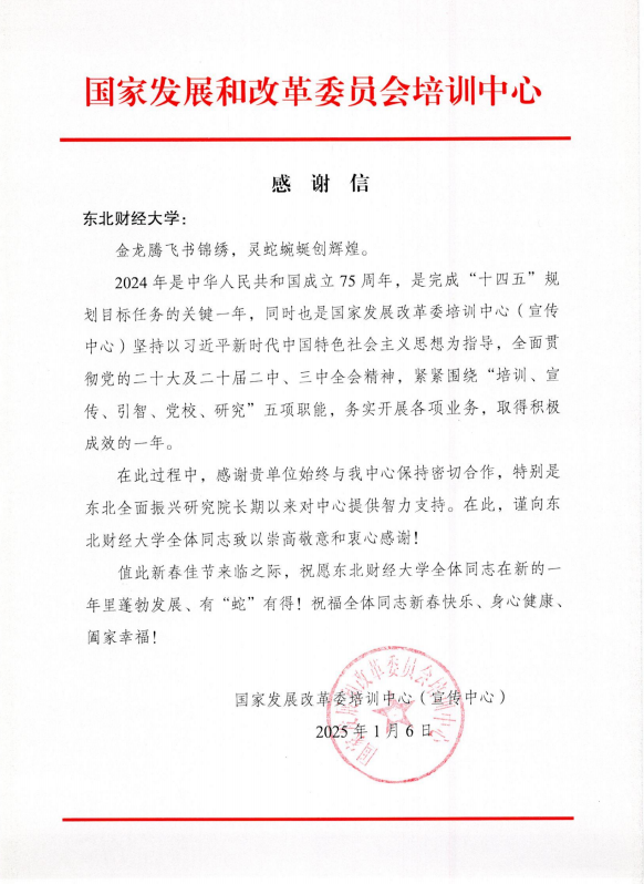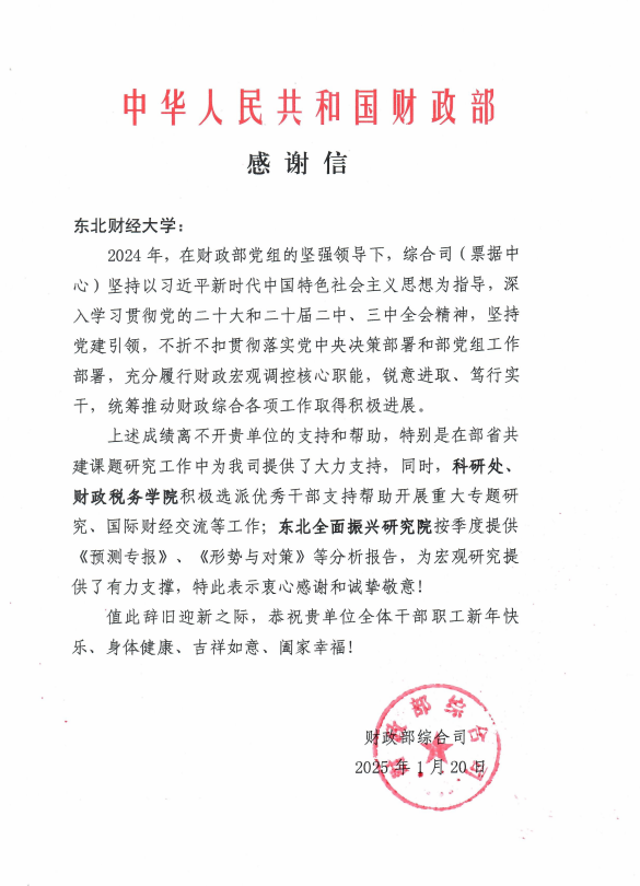 近日,财政部、国家发展和改革委员会相关司(室、中心)向东北财经大学发来感谢信,并致以新年祝福。财政部综合司对东北财经大学科研处、财政税务学院、东北全面振兴研究院在部省共建课题研究、优秀干部选派、定期报送《预测专报》《形势与对策》等方面提供的大力支持,表示衷心感谢和诚挚敬意;财政部政策研究室对东北财经大学经济学院、东北全面振兴研究院在委托课题研究、重要文稿报送等方面所作的贡献致以诚挚谢意;国家发展和改革委员会培训中心(宣传中心)对与东北财经大学的密切合作及东北全面振兴研究院的智力支持表达敬意和感谢。