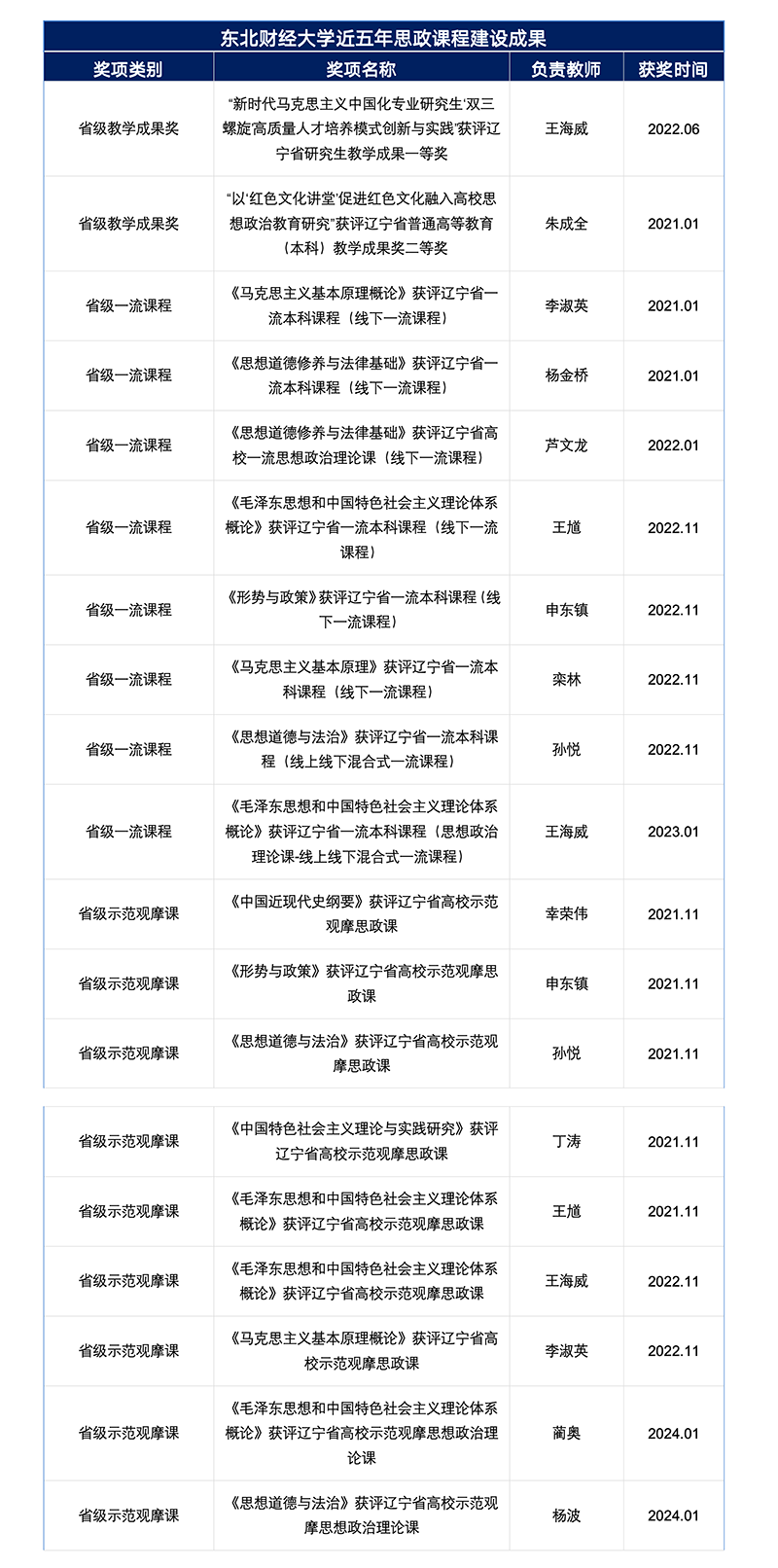 在学校党委坚强领导下,马克思主义学院坚持以习近平新时代中国特色社会主义思想为指导,落实立德树人根本任务,以培养德智体美劳全面发展的社会主义建设者和接班人为目标,以省级一流课程和省级示范观摩课为抓手,深耕课堂教学,持续深化课程改革创新,打造出了一批具有引领示范效应的省级精品课程,其中省级一流课程8门、省级示范观摩课9门,1门课程被推荐参评第三轮国家一流课程,获评辽宁省研究生教学成果奖一等奖1项、辽宁省本科教学成果奖二等奖1项,充分彰显了思政课的理论厚度和现实温度,为深化课程改革提供了宝贵的实践经验。