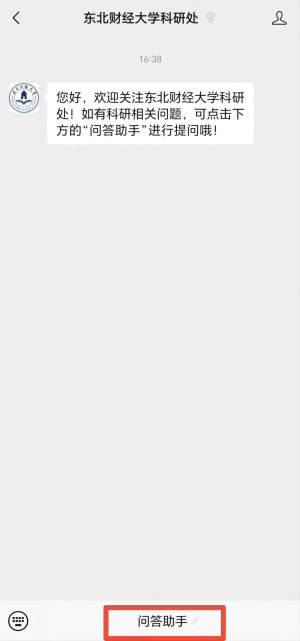 关注公众号“东北财经大学科研处”,点击“发消息”按钮后,进入聊天界面,点击下面的“问答助手”即可进入“AI助手”问答界面。如下图所示: