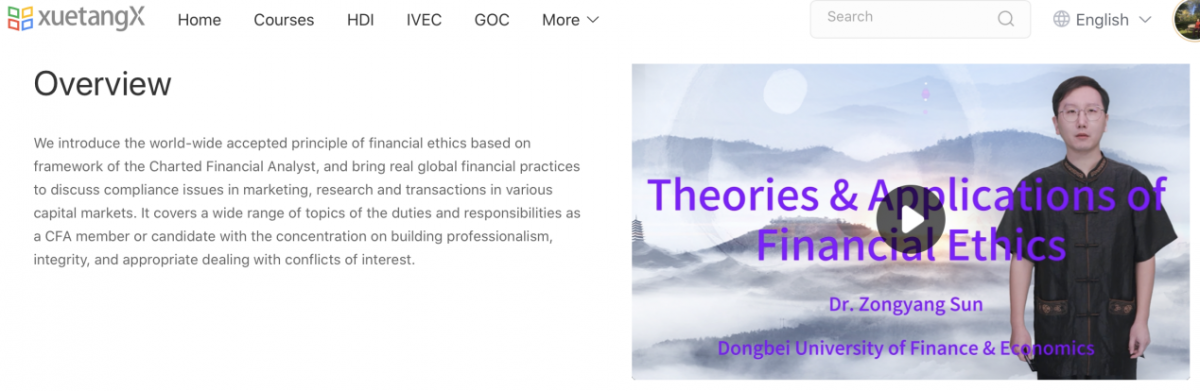 根据教育部《国家智慧教育平台国际版建设方案》部署,由东北财经大学申报,教育部在线教育研究中心课程委员会评审,国际商学院经济与金融教研室教师孙宗扬建设的“金融职业道德原理与实践(Theories & Applications of Financial Ethics)”课程获批上线国家智慧教育平台国际版。课程基于全球资本市场公认的特许金融分析师(CFA)道德准则框架,结合真实的全球资本市场实践,引入中国传统哲学,联系古今、对比中外,深刻地讲述了金融职业道德在面临当前金融科技与金融创新日益发展的挑战时所扮演的重要角色,并强调国家对资本市场秩序进行监管的重要性,强化现代金融专业人才培养中的课程思政与职业道德素养提升。
