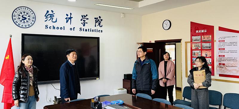 调研座谈会前,孙武军实地走访了统计学院各办公室,了解学院相关情况。
