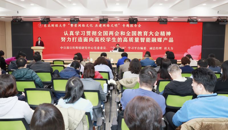 为深入学习贯彻习近平总书记关于网络强国的重要思想,全面贯彻落实全国两会精神和全国教育大会精神,创新网络思政教育,提高网络育人能力,3月18日,东北财经大学举办“繁荣网络文化 共建网络文明”专题报告会。中宣部宣传舆情研究中心党委委员,“学习强国”学习平台编委、副总经理杜大力受邀作专题报告。学校党委常委、宣传部部长计艳平主持会议。