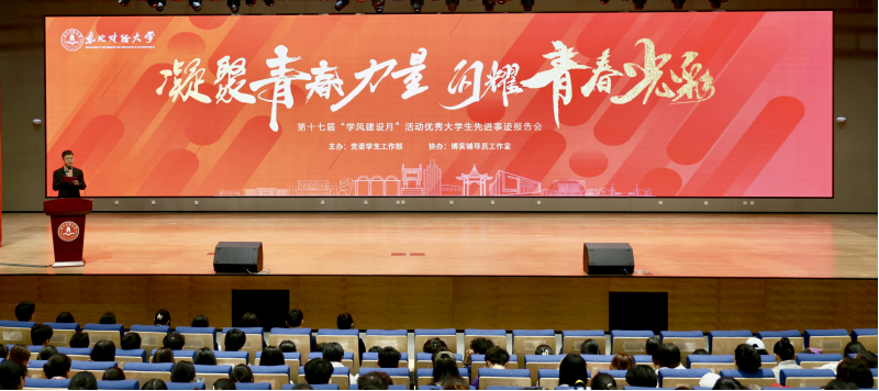 为进一步发挥学生榜样示范引领作用,东北财经大学在第十七届“学风建设月”活动期间,组建了新一届优秀大学生报告团。4月28日至29日,优秀大学生报告团分两场在笃行楼礼堂举办“凝聚青春力量,闪耀青春光彩”优秀大学生先进事迹报告会。各学生培养单位900余名师生代表参加报告会。