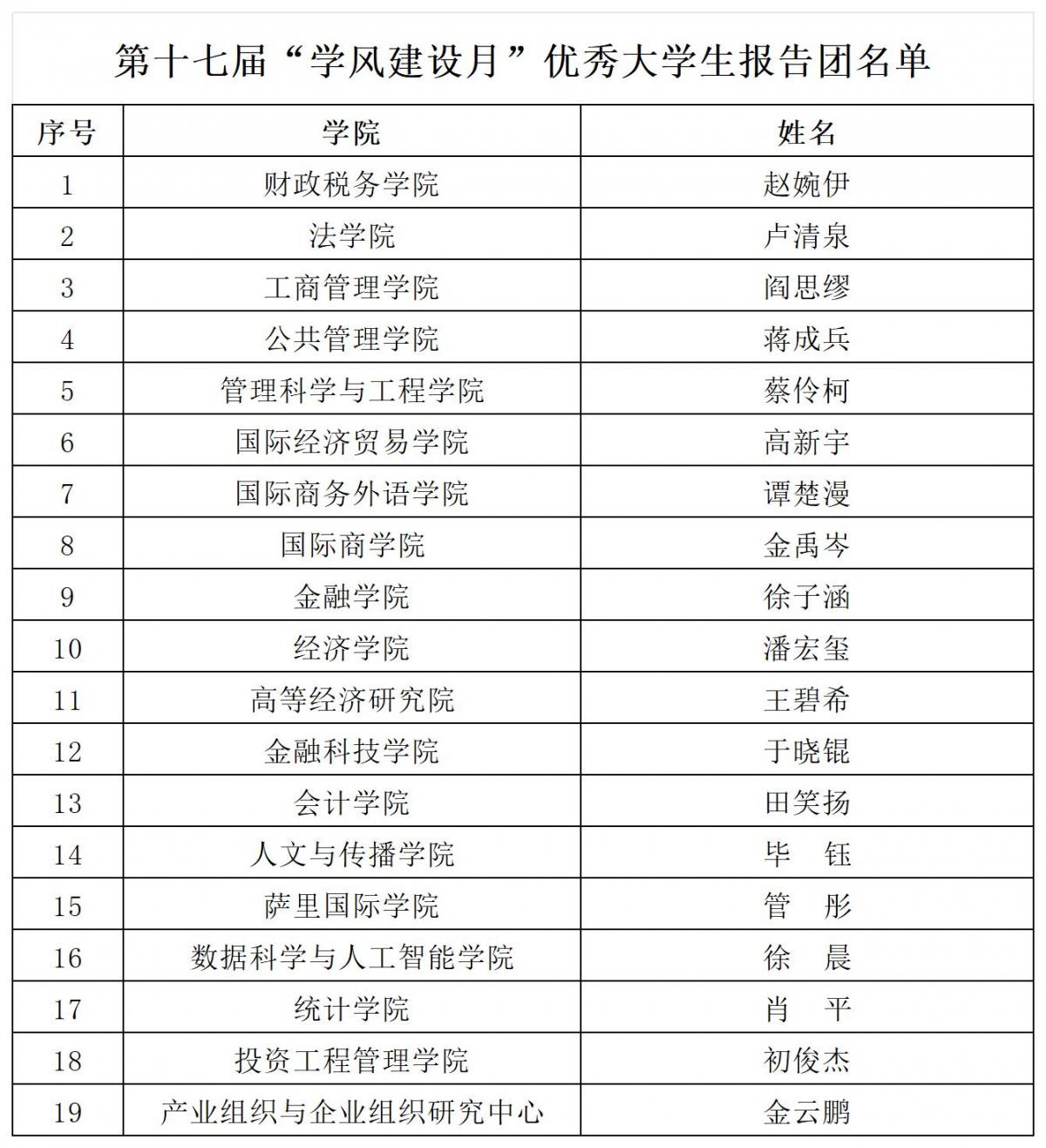 报告会上,19位报告团成员全面总结大学学习生活,围绕学好专业课程、提升综合能力、选定发展方向等方面分享心路历程,就学研竞赛、社团活动、党团工作、志愿服务等主题传授经验、提供方法,其中有走进田间地头“将论文写在祖国大地上”的不懈追求,有设计个性化运营模式助力乡村振兴的宝贵经历,有激励自己“再坚持一下”最终斩获国赛大奖的难忘回忆。报告团成员以青年的视角、青春的表达,生动展现新时代东财学子的使命担当,在学风建设进程中引领个人全面发展,鼓励广大青年学子在为中国式现代化挺膺担当中放飞青春梦想、描绘宏图画卷。
