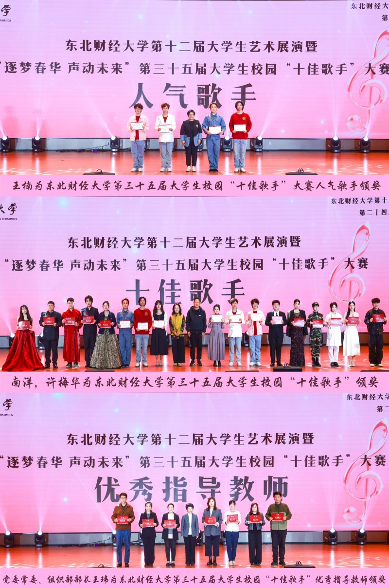 东北财经大学大学生校园“十佳歌手”大赛起源于1990年,经过35年的传承发展,形成了浓厚的以美育人、以美化人、以美培元的浸润式育人氛围,成为学校文化艺术节的重要比赛项目和“第二课堂”思政育人品牌活动。在本次大赛中,东财学子在展现自身才华的同时,与同学、师长积极合作,携手歌唱理想与希望、唱响时代强音,展现了东财青年朝气蓬勃、昂扬向上的青春风采,在强国建设、民族复兴伟业中应有的使命担当和携手奋进的强大力量。未来,东财青年将持续歌以咏志,声动未来,听党话、跟党走,奋力书写青春为中国式现代化挺膺担当的东财篇章!