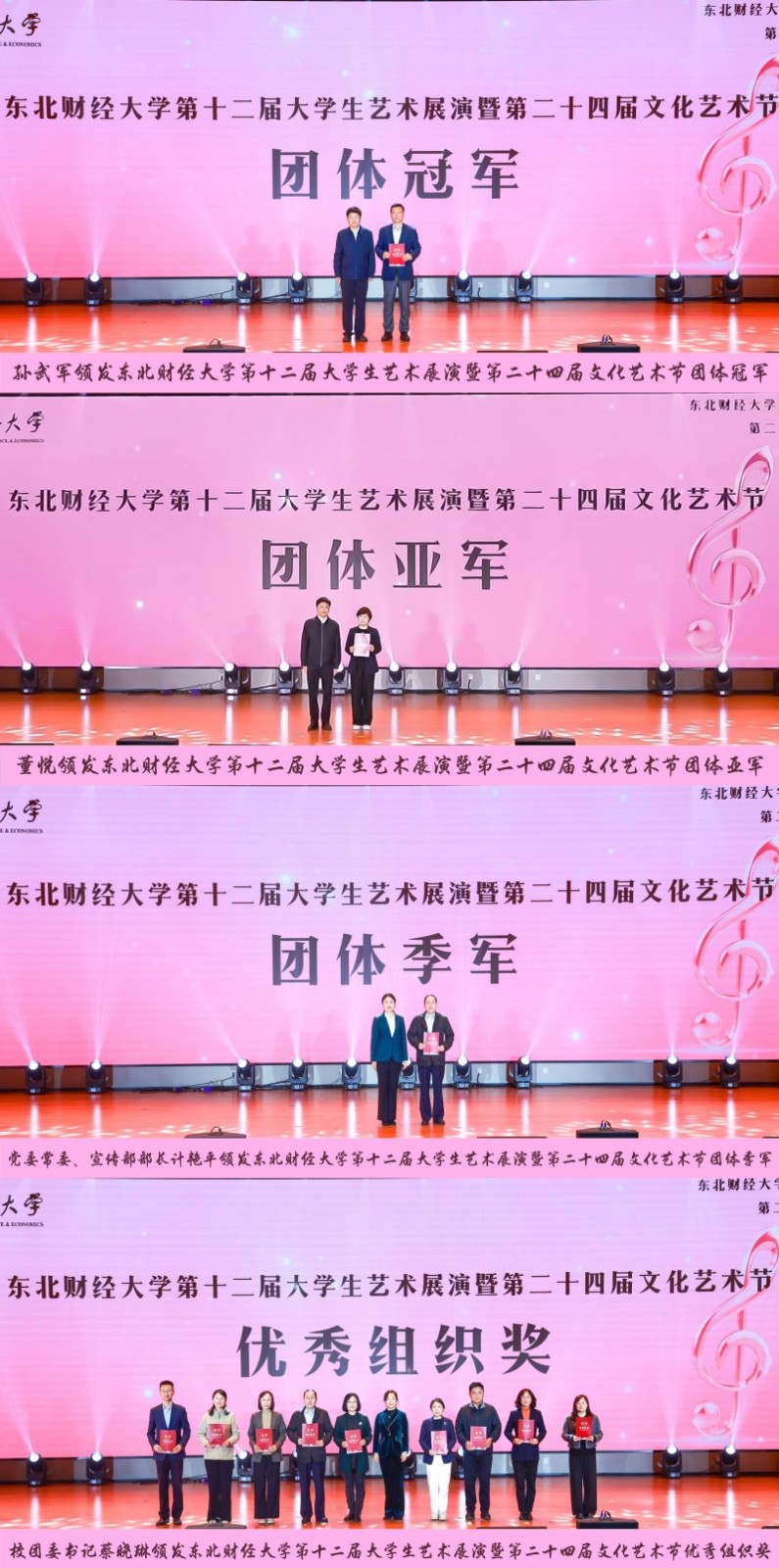 东北财经大学第十二届大学生艺术展演暨第二十四届文化艺术节设立团体冠军、团体亚军、团体季军和优秀组织奖。本次大赛与2025年度师生书法大赛、师生美术摄影作品大赛、廉洁文化情景剧视频作品大赛获奖作品均可获得团体积分,各单项赛事积分加和计入团体总分,根据团体总分及活动组织、学生参与度、活动效果等评选文化艺术节团体奖项。最终,国际商学院、会计学院、工商管理学院分别荣获团体冠军、团体亚军、团体季军,财政税务学院、工商管理学院、管理科学与工程学院、国际经济贸易学院、国际商学院、会计学院、金融科技学院、经济学院、投资工程管理学院荣获优秀组织奖。