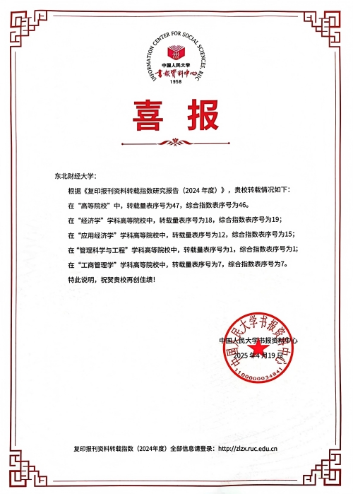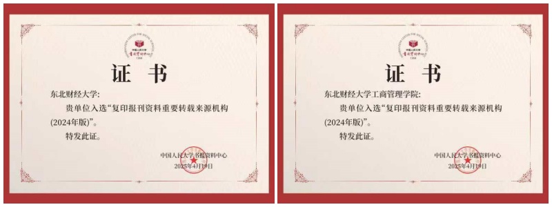近日,中国人民大学书报资料中心发布《复印报刊资料转载指数研究报告(2024年度)》和《复印报刊资料重要转载来源机构(2024年版)》两项“人大转载”学术评价成果。东北财经大学(一级机构)及东北财经大学工商管理学院(高等院校所属机构)分别入选“人大复印报刊资料重要转载来源机构”。