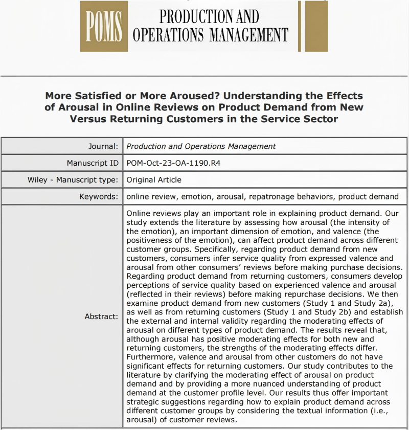 近日,东北财经大学数据科学与人工智能学院徐健教授、张婧副教授及硕士研究生杨中华,与美国新墨西哥大学王学群教授、美国爱荷华大学樊卫国教授、吉林大学姚晓旭博士合作的研究成果“More Satisfied or More Aroused? Understanding the Effects of Arousal in Online Reviews on Product Demand from New Versus Returning Customers in the Service Sector”在UTD24期刊Production and Operations Management 上在线发表。徐健教授与张婧副教授为共同一作。