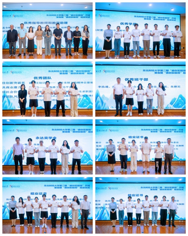 第一期实验班颁奖仪式上,东北财经大学创新创业学院直属党支部书记徐刚为荣获优秀指导教师和教学助理的教师颁发奖杯,学校教务处处长刘凌冰、合作发展与校友工作办公室主任韩非、发展规划与学科建设处副处长段志锦为荣获“优秀学员”“优秀班干部”和“优秀团队”的一期学员颁发荣誉证书,王博为荣获“永达”奖学金的学员颁发荣誉证书。刘凌冰、胡国栋共同为23名鼎创实验班一期学员颁发结业证书与徽章。