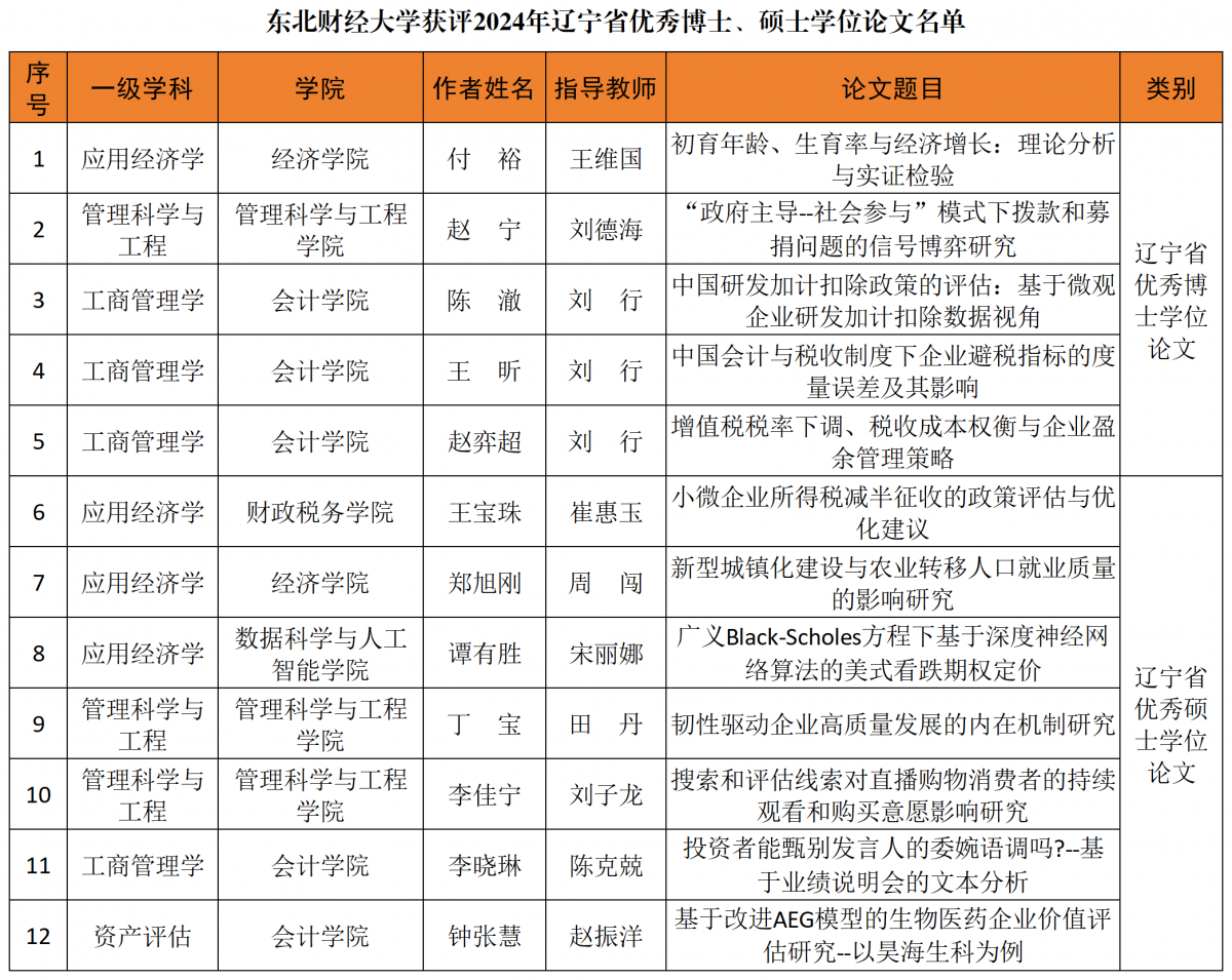 近日,辽宁省教育厅公布了2024年优秀博士、硕士学位论文评选结果,东北财经大学共有12篇学位论文入选。其中,7篇硕士研究生学位论文获评辽宁省优秀硕士学位论文,5篇博士研究生学位论文获评辽宁省优秀博士学位论文,博士论文获奖篇数创历年新高。