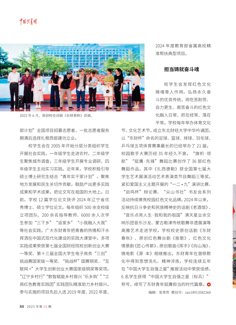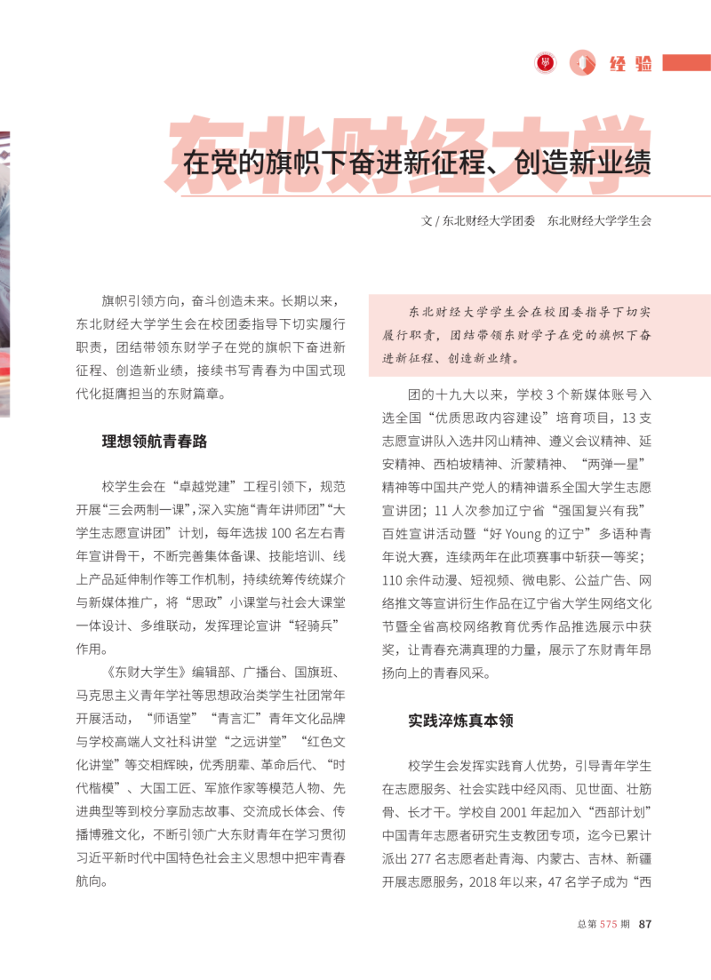 近期,由共青团中央主管主办的《中国共青团》2025年第13期专刊发布中华全国青年联合会第十四届委员会全体会议和中华全国学生联合会第二十八次代表大会特辑。东北财经大学团委、学生会应邀分享《东北财经大学:在党的旗帜下奋进新征程、创造新业绩》工作经验。相关报道并在中国共青团杂志微信官方公众号发布:https://mp.weixin.qq.com/s/qyuGBvtSEG9-9XYTQAB09g