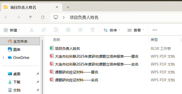 1.电子版材料:请将《大连市社科联2025年度研究课题立项申报表》PDF版实名1份、匿名1份;课题研究佐证材料(如有多个佐证材料请合成一个PDF文件,课题研究佐证材料包括与申报课题相关的公开发表、出版以及获采用、领导批示的成果;外文成果请附以中文注解)PDF版实名1份、匿名1份;《大连市社科联2025年度研究课题立项申报汇总表》打包上传至科研创新服务平台——项目申报中,各项材料命名要求如下图。