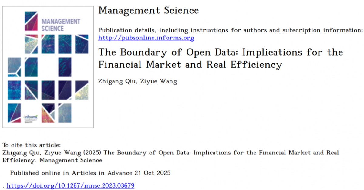近日,东北财经大学金融科技学院王子悦副教授的合作论文“The Boundary of Open Data: Implications for the Financial Market and Real Efficiency”,被国际顶级期刊INFORMS Management Science 正式接收发表,该论文合作者为中国人民大学深圳金融高等研究院副院长邱志刚。