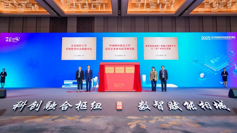 开幕式现场,东北财经大学工商管理学院院长郑文全与相城区常委、相城经开区党工委副书记、管委会副主任沈春荣共同为“东北财经大学苏州数智经济创新中心”揭牌。该中心的设立,是东北财经大学服务国家战略、推动区域协同发展的重要举措,为学校在长三角地区搭建了关键的产学研合作平台,将有效促进学科建设、人才培养与产业发展需求的精准对接。