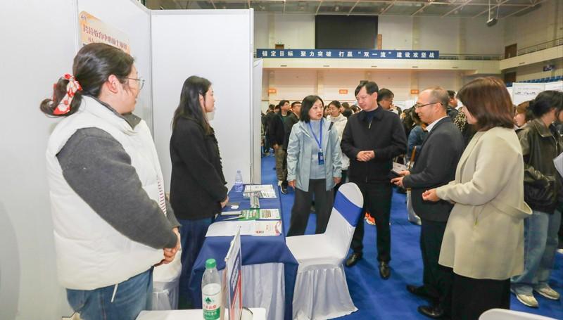 为深入贯彻落实党中央、国务院关于高校毕业生就业工作决策部署,全力做好2026届毕业生就业工作,11月4日,全国金融行业招聘会暨2025年辽宁共青团“百校千岗”活动——“逐梦金秋·职为你来”东北财经大学2026届毕业生秋季就业“双向选择”洽谈会(第二场)在学校体育馆成功举办。学校党委书记方红星,党委副书记、校长汪旭晖,校领导刘险峰、施锦芳深入双选会现场,对前来参加双选会的用人单位表示热烈欢迎,并与参加双选会的毕业生亲切交流。