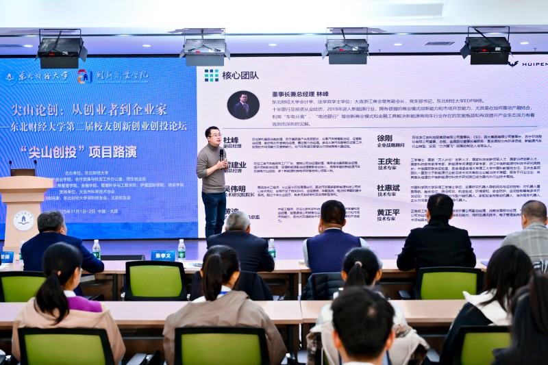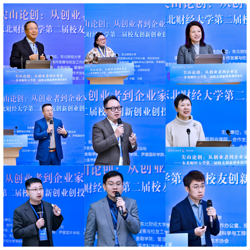 在大会主题报告环节,大连林家铺子食品股份有限公司董事长林楠以“创新、纳新、历久弥新”为题,指出企业须以创新思维打破路径依赖;辽宁天久企业集团董事局主席黄晓冬围绕“以东财底色铸根基,以实干初心赴山海”,回顾了在校期间的美好回忆,和打破常规、投身创业的人生经历;中证汇成基金董事长叶亚丽以“拨云寻路道深处,觉来满眼是青山”为题,从商业投资的角度解读了当前经济形势下创业者面临的挑战,并倡议学校充分发挥平台价值,助力创业者到企业家的转型;深圳森瑞私募证券基金有限公司董事长林存聚焦“中国创新药——寒冬中的新质生产力”主题,分析了生物医药领域的创新机遇;东北财经大学数字经济研究院副院长李博阳以“EX机器人——以人形机器人为核心打造沉浸式体验新空间”为题,展示了人形机器人应用场景开发和机器人生态体系建设的前沿成果;约取教育咨询创始合伙人崔葳以“创业与就业:全球视角下的大学生职业规划”为题,提供了全球视野下大学生职业发展的前瞻性指引;互联派教育科技创始人兼CEO孟令峰分享了“互联派如何成为一家AI驱动成长的公司”的实战经验;深圳市坤誉低碳科技有限公司董事长陶泰燃深入解读了“国家‘双碳’战略下的新能源行业创业与投资机会”,为绿色转型背景下的投资与产业布局提供了专业视角;大连富生制药有限公司副总经理鲁可思以“产融赋能医药创新,诠释民族品牌担当”为题,探讨了金融资本与医药产业深度融合的发展路径。