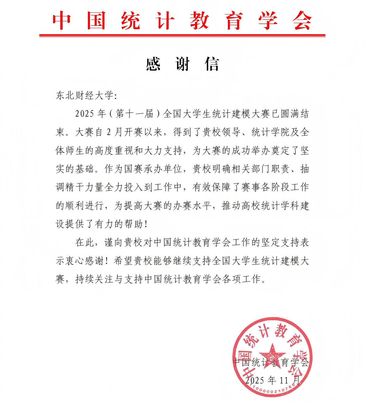 作为本届大赛国赛承办单位,东北财经大学高度重视赛事组织工作,确保赛事筹备、组织实施、后勤保障等各项任务高效落地,为参赛师生营造公平公正、高效顺畅的赛事环境,赢得中国统计教育学会、各参赛高校及广大参赛学生的一致好评。中国统计教育学会在感谢信中表示,东北财经大学的全力支持为大赛的圆满成功提供了关键保障,衷心感谢学校对学会工作的长期信任与坚定支持,期待未来与学校持续深化合作,共同推动全国统计教育事业高质量发展。