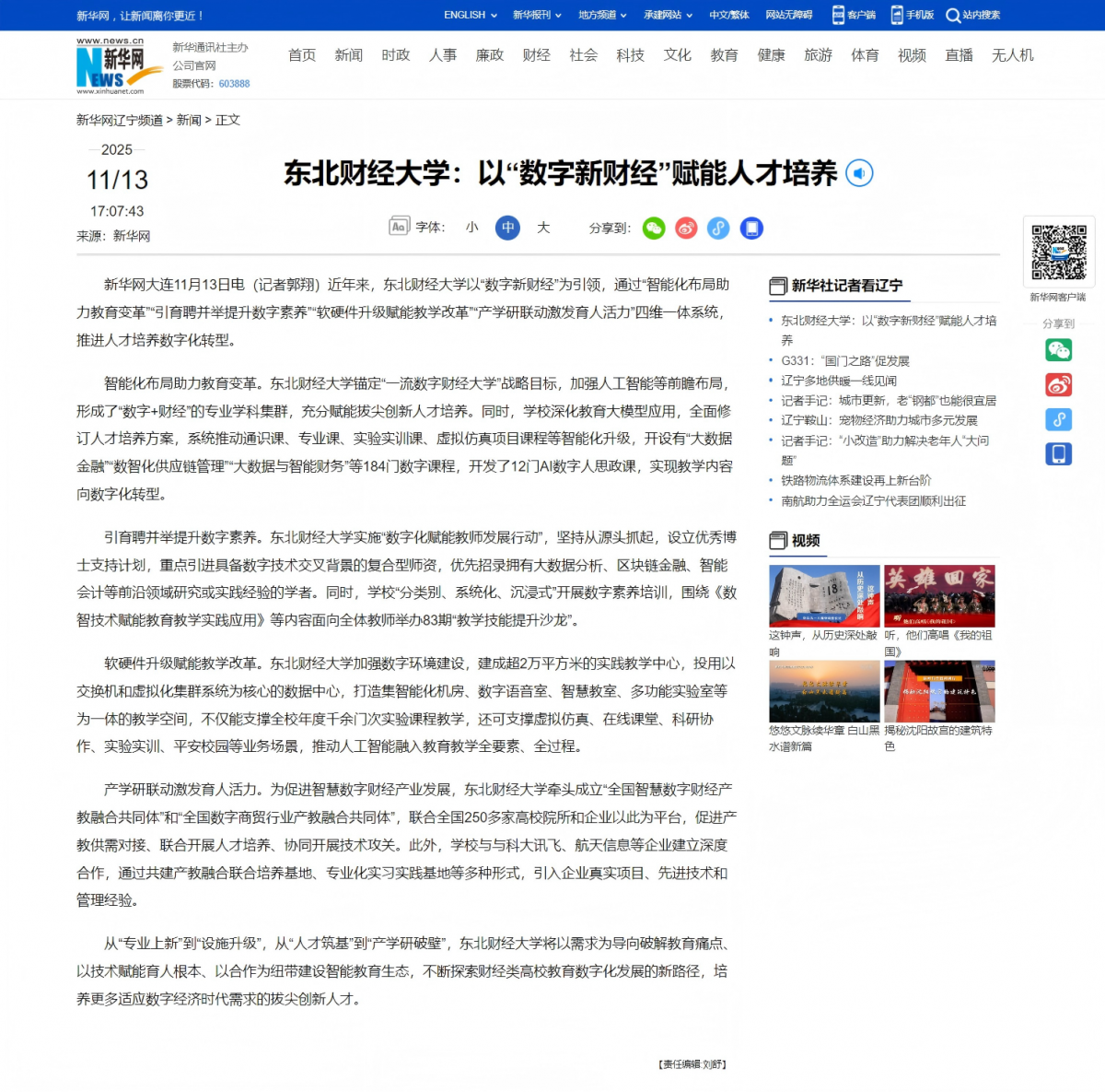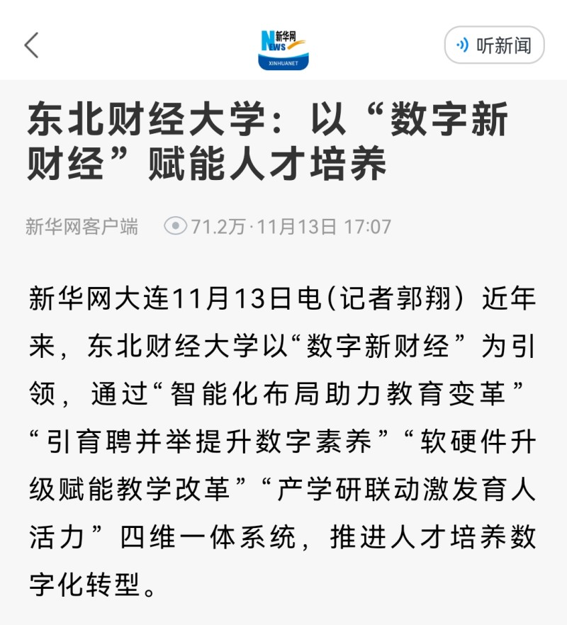 11月13日,新华网以《东北财经大学:以“数字新财经”赋能人才培养》为题,对学校推进人才培养数字化转型的系列举措进行了专题报道。