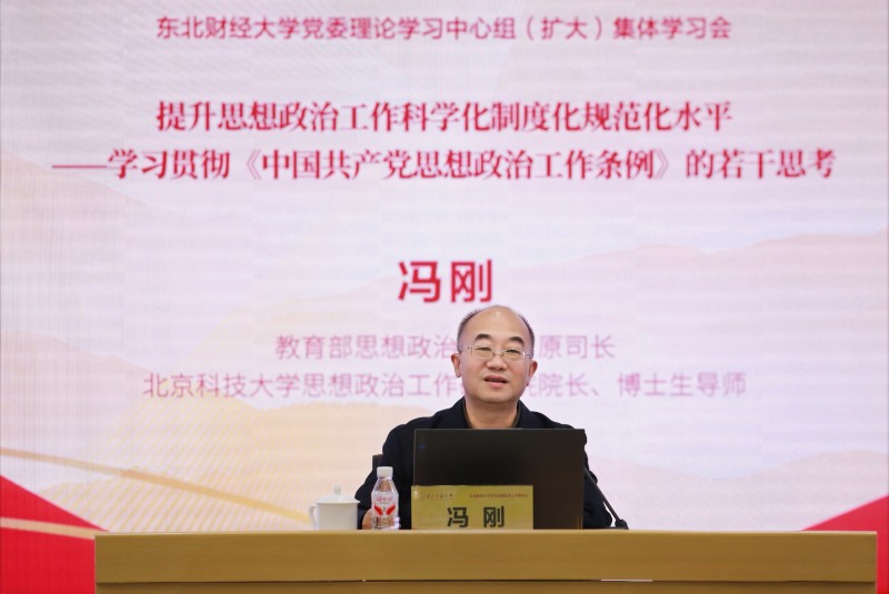 北京科技大学思想政治工作研究院院长冯刚教授受邀作了题为《提升思想政治工作科学化制度化规范化水平——学习贯彻〈中国共产党思想政治工作条例〉的若干思考》的专题辅导报告,对《条例》的出台背景、重大意义、总体框架、任务要求等方面进行了全面系统的梳理和解读。报告紧扣《条例》原文和高校思想政治工作实际,就《条例》的贯彻落实分享了深刻见解、勾勒了可行路径,既有理论层面的系统剖析,又有实践层面的精准指导,进一步加深了与会人员对于《条例》核心要义、丰富内涵和实践要求的理解和把握,为学校推进思想政治工作创新发展、凝聚起强大的思政引领力提供了清晰指引。