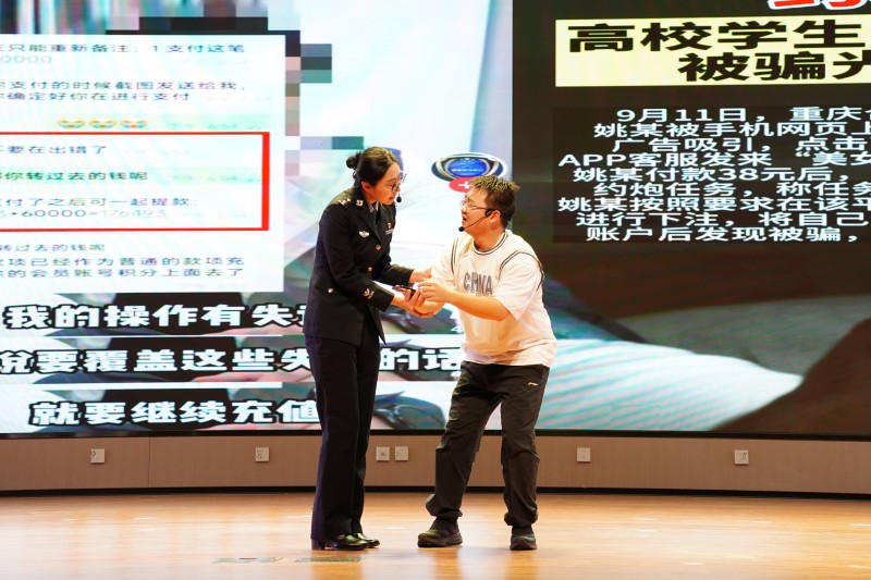 长期以来,东北财经大学携手属地沙河口公安机关,建立了从日常安全保障到应急处突支援,从法治宣传教育到校园秩序维护协同共建的高效协作机制。本次情景剧排演是校警双方在安全教育与思想政治教育融合领域的又一重要探索和创新实践。该剧以近年来高发的校园电信网络诈骗真实案例为蓝本,由黑石礁派出所一线民警与在校大学生联合创作、共同演绎。剧情紧贴校园生活实际,通过还原“冒充熟人诈骗”“浏览不良网站诈骗”“网络刷单诈骗”“虚假购物诈骗”等典型场景,逼真展现了诈骗分子的作案套路与伎俩,细腻刻画了受骗学生的心理变化过程。在精彩的剧情演绎中,巧妙融入法治教育、诚信教育和社会责任教育,将枯燥的反诈知识转化为鲜活的舞台呈现,既具艺术感染力,又富教育实效性,让观众在沉浸式体验中深刻认识到电信网络诈骗的危害性,切实提升反诈意识和能力。