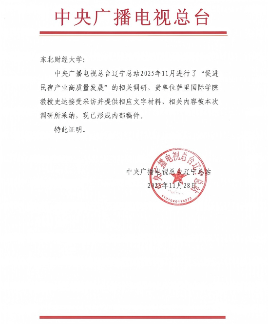 11月28日,中央广播电视总台辽宁总站向东北财经大学发来感谢信,对萨里国际学院史达教授及其研究团队在“促进民宿产业高质量发展”专题调研中提供的专业支持和智力贡献表示衷心感谢。