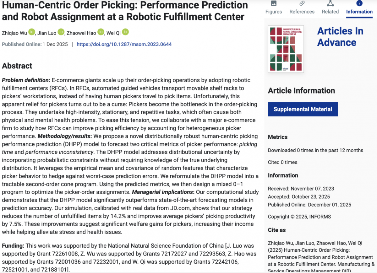 东北财经大学管理科学与工程学院、辽宁省大数据管理与优化决策重点实验室吴志樵教授与现代供应链管理研究院郝兆伟副教授的合作论文“Human-Centric Order Picking: Performance Prediction and Robot Assignment at a Robotic Fulfilment Center”被国际顶级期刊Manufacturing & Service Operations Management 正式接收发表,该论文合作者为海南大学Jian Luo教授,清华大学的Wei Qi教授。