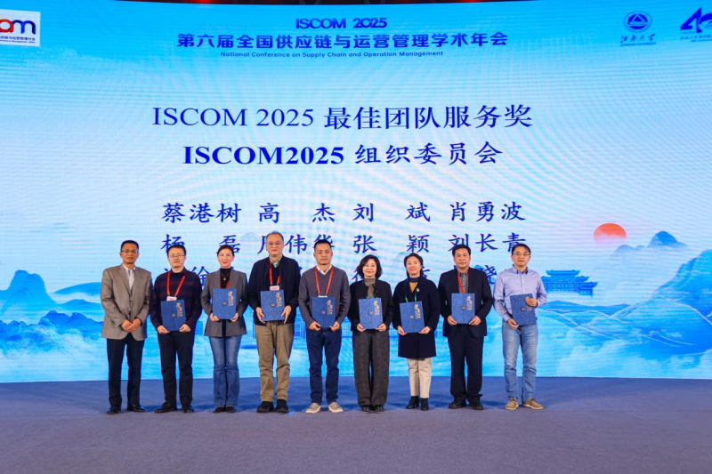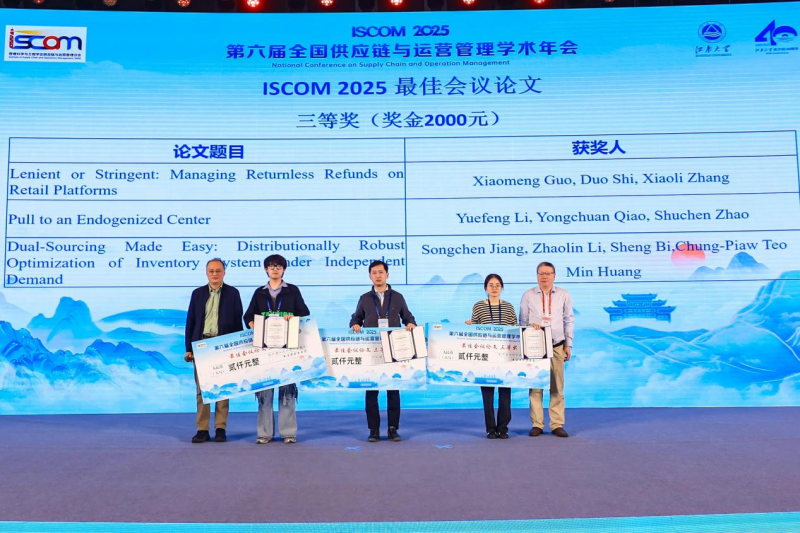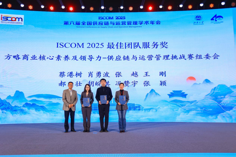 年会共评选出最佳会议论文一等奖1篇,二等奖2篇,三等奖3篇,优秀奖4篇。其中东北财经大学高等经济研究院赵书辰副教授获得最佳会议论文三等奖。同时会议公布了“方略商业核心素养及领导力-供应链与运营管理挑战赛”的获奖名单,并颁发了ISCOM 2025最佳个人服务奖、最佳团队服务奖、团队特别贡献奖。其中,东北财经大学现代供应链管理研究院副院长张颖作为ISCOM 2025组委会成员获得最佳团队服务奖及方略商业核心素养及领导力挑战赛组委会最佳团队服务奖。