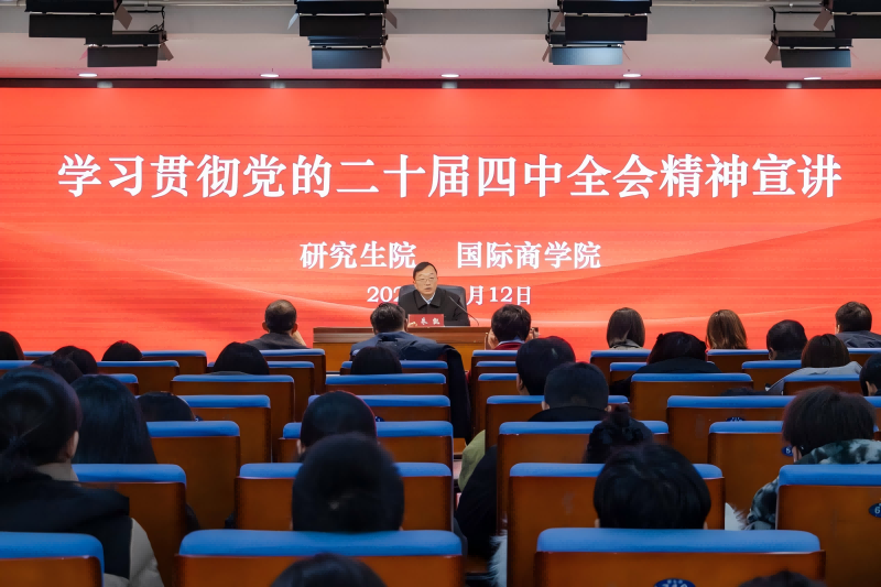 为深入学习贯彻党的二十届四中全会精神,引导师生深入领会全会精神核心要义,凝聚推动学校高质量发展的思想共识,12月12日,国际商学院与研究生院在图书馆学术报告厅联合举办学习贯彻党的二十届四中全会精神宣讲活动,邀请学习贯彻党的二十届四中全会精神学校宣讲团成员、校长助理朱凯作宣讲报告。