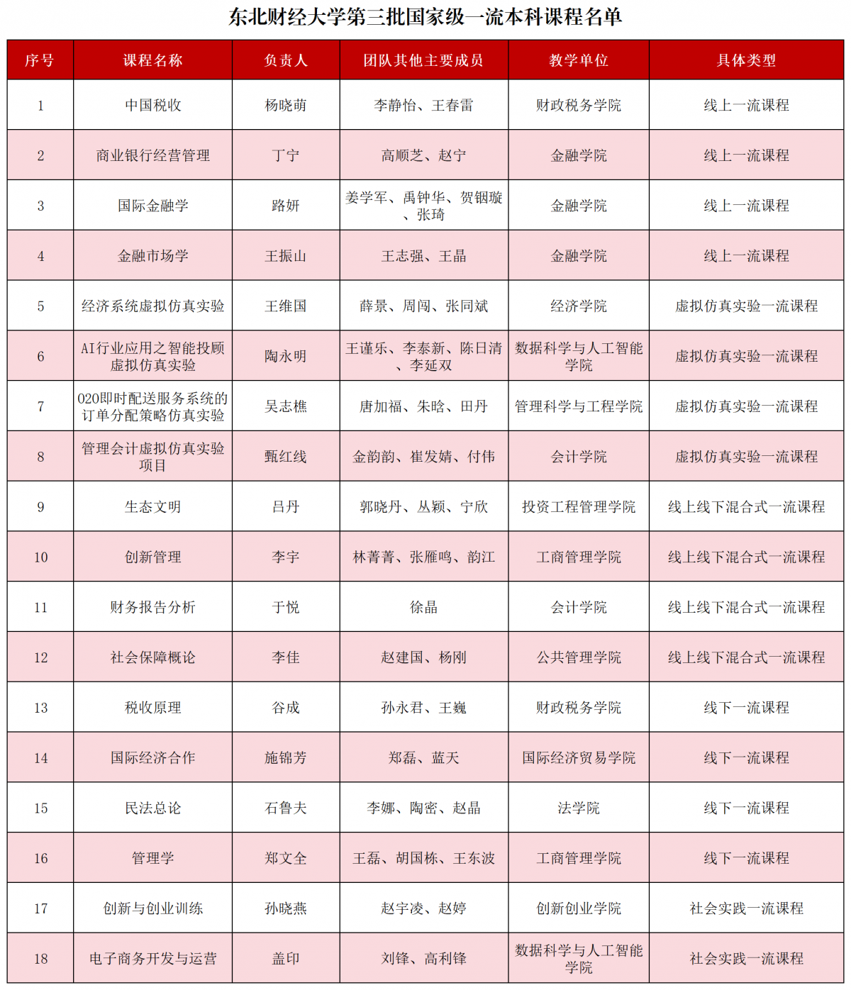 12月26日,教育部公布了第三批国家级一流本科课程认定结果,东北财经大学18门课程获得认定,数量居全国财经类高校第2名、辽宁省属高校第1名。