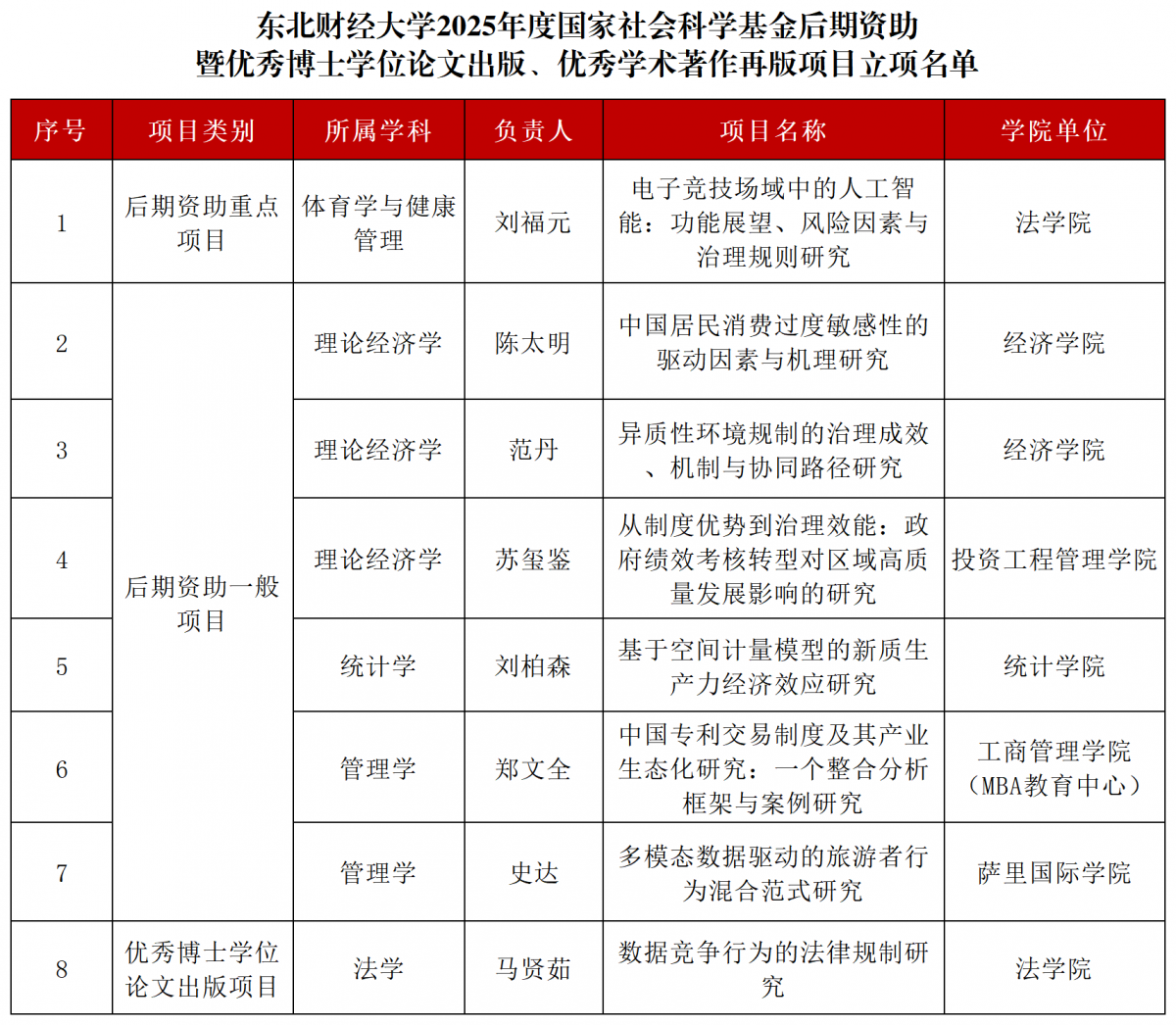12月23日,全国哲学社会科学工作办公室公布了2025年度国家社会科学基金后期资助暨优秀博士学位论文出版、优秀学术著作再版项目名单,东北财经大学获批8项,其中后期资助重点项目1项、后期资助一般项目6项、优秀博士学位论文出版项目1项,立项数量居全国财经类高校第4名,创历史新高。优秀博士学位论文出版项目是辽宁省高校获批的唯一一项。