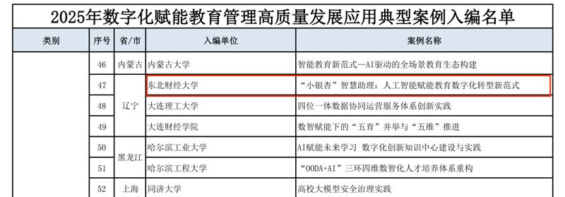 近日,教育部主管的中国教育信息化杂志社公布《2025年数字化赋能教育管理高质量发展应用典型案例》名单,东北财经大学“‘小银杏’智慧助理:人工智能赋能教育数字化转型新范式”成功入选高校教育管理高质量发展应用典型案例,成为全国42所入选高校之一。