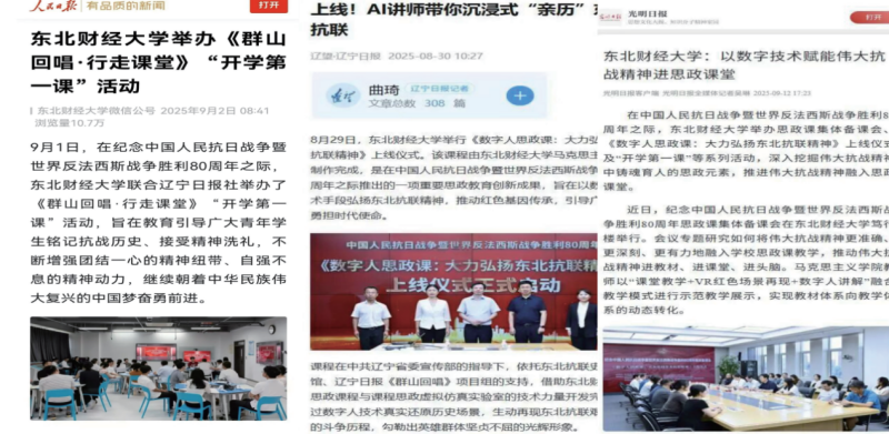 学校马克思主义学院深入贯彻落实习近平总书记关于学校思政课建设的重要指示精神,依托东北财经大学“思政课程与课程思政协同育人虚拟仿真教学创新实验室”,开发《数字人思政课:大力弘扬东北抗联精神》《数字人思政课:学习贯彻党的二十届四中全会精神》等系列数字人课程,教学案例主要包括“党的创新理论篇”“英雄人物篇”“经典战役篇”“精神传承篇”,运用AI技术还原历史场景,深入挖掘东北抗联精神内涵,打造“课堂教学+VR红色场景再现+数字人讲解”融合教学模式,引导广大师生赓续红色血脉、坚定理想信念、勇担时代使命。在“开学第一课”等日常教学实践中受到较好反响,相关案例应用情况获《人民日报》《光明日报》《辽宁日报》宣传推广。