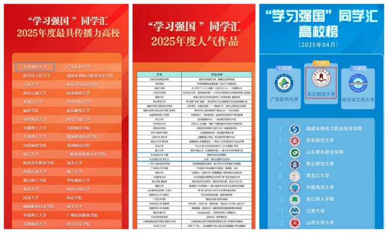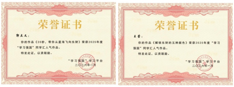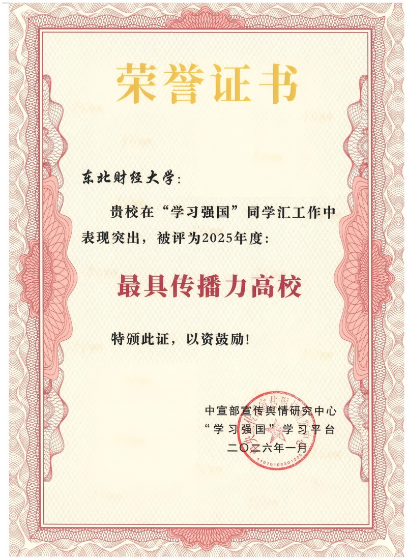 近日,“学习强国”学习平台公布了“学习强国”同学汇2025年度评选结果。东北财经大学再次被中宣部宣传舆情研究中心、“学习强国”学习平台授予“最具传播力高校”荣誉称号,党委宣传部郭立文、王萱的2件作品获评2025年度人气作品。