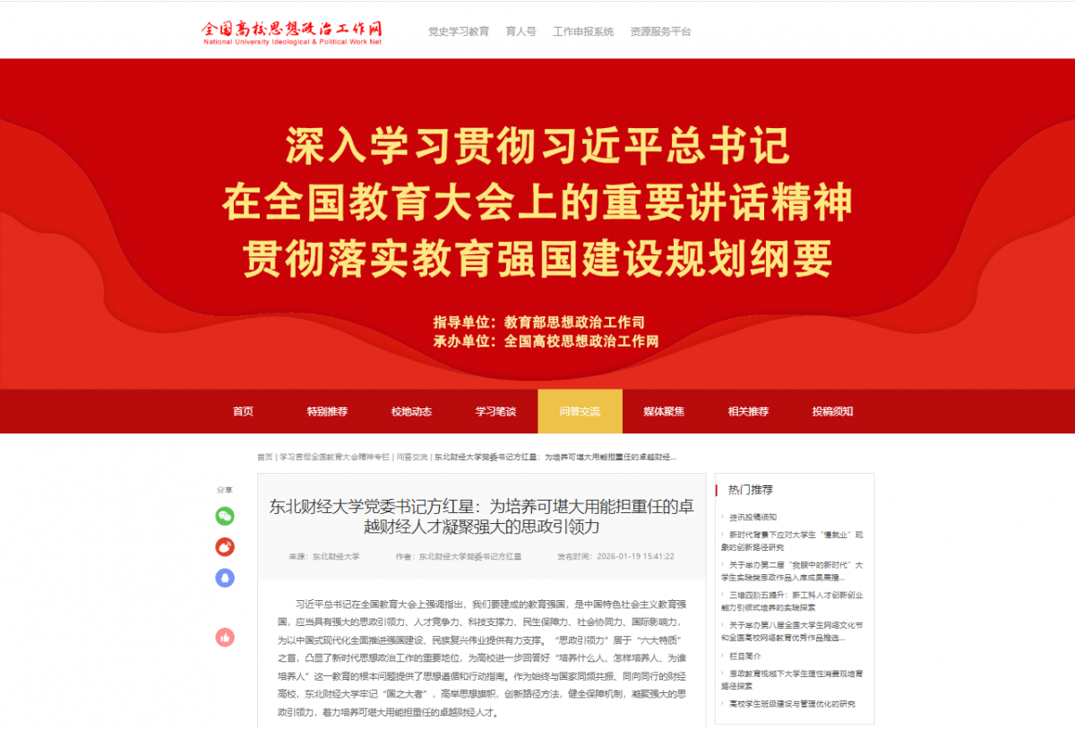 2026年1月19 日,全国高校思想政治工作网刊发东北财经大学党委书记方红星署名文章《为培养可堪大用能担重任的卓越财经人才凝聚强大的思政引领力》。