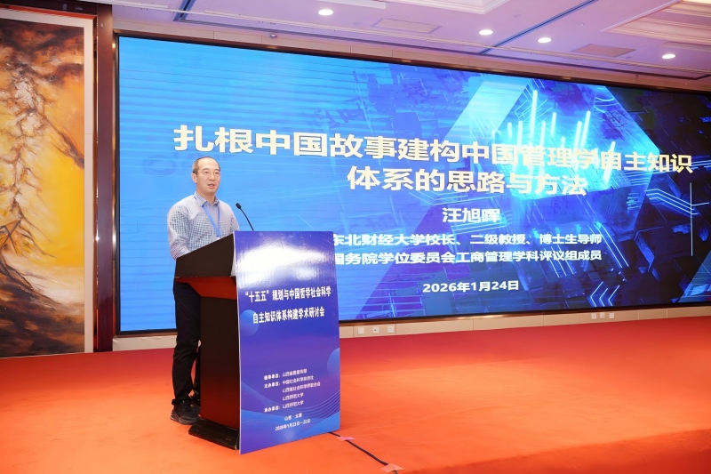 1月23日至25日,由中国社会科学杂志社与山西省社会科学界联合会、山西师范大学联合举办的“‘十五五’规划与中国哲学社会科学自主知识体系构建”学术研讨会在山西太原举行。东北财经大学党委副书记、校长汪旭晖应邀出席本次研讨会并作题为“扎根中国故事建构中国管理学自主知识体系的思路与方法”的主旨演讲。