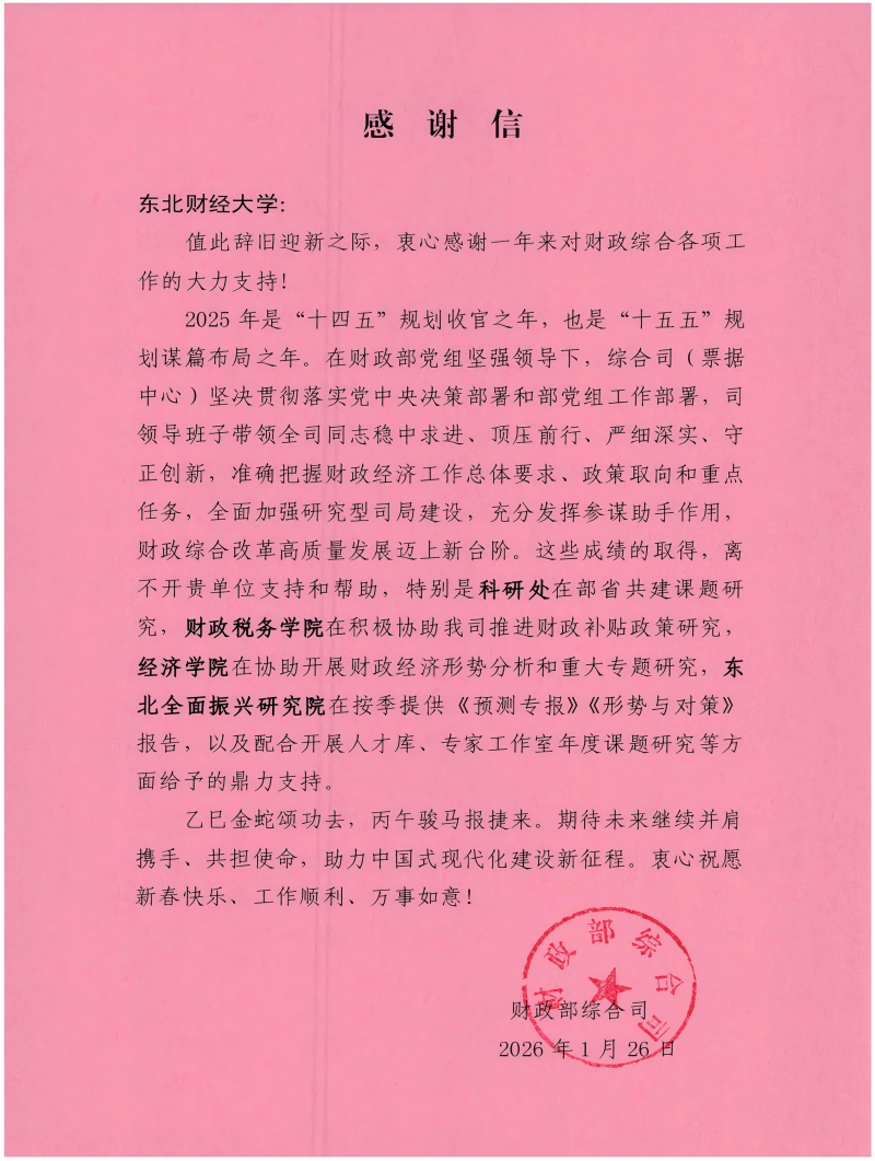 近日,财政部综合司向东北财经大学发来感谢信,衷心感谢学校一年来对财政综合各项工作的大力支持,并致以新春祝福。信中特别提到,学校科研处、财政税务学院、经济学院、东北全面振兴研究院在部省共建课题研究、推进财政补贴政策研究、开展财政经济形势分析和重大专题研究、定期报送《预测专报》《形势与对策》及配合开展人才库、专家工作室年度课题研究等方面,对财政部综合司工作给予了鼎力支持。