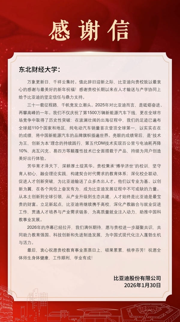 近日,东北财经大学收到来自比亚迪股份有限公司的感谢信。在辞旧迎新之际,比亚迪向学校致以诚挚感谢与新春祝福,对双方在人才输送与产学协同等领域的深度合作成果给予高度肯定。