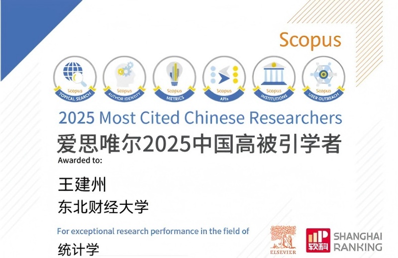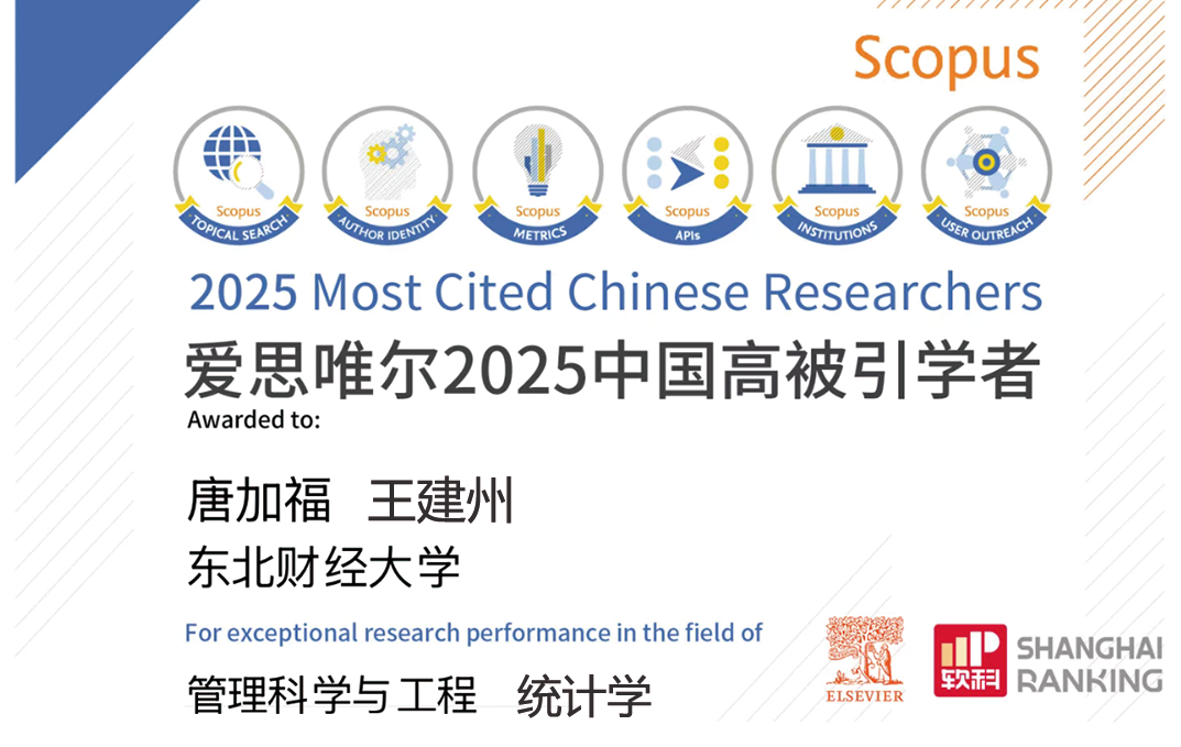 1月30日,爱思唯尔(Elsevier)发布2025年“中国高被引学者”(Highly Cited Chinese Researchers)榜单。东北财经大学管理科学与工程学院唐加福教授、统计学院王建州教授分别入选“管理科学与工程”“统计学”学科2025年度“中国高被引学者”。这是唐加福教授继2020年以来连续六年荣登“管理科学与工程”领域“中国高被引学者”榜单,王建州教授继2019年入榜“数学”领域、2020至2024年入榜“统计学”领域“中国高被引学者”以来,连续七年荣登榜单。