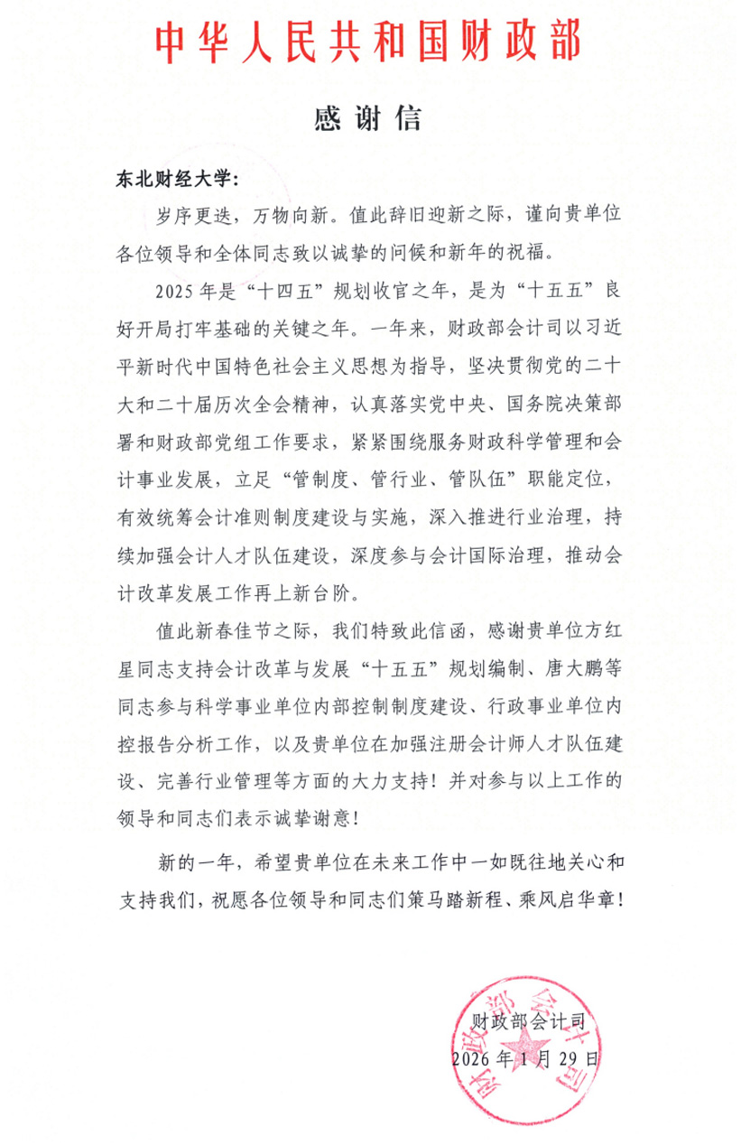 近日,财政部会计司向东北财经大学发来感谢信,对方红星教授支持会计改革与发展“十五五”规划编制、唐大鹏教授等专家参与科学事业单位内部控制制度建设、行政事业单位内控报告分析工作,以及学校在加强注册会计师人才队伍建设、完善行业管理等方面的大力支持,表示诚挚谢意。此次收到感谢信,是财政部对东北财经大学在财会领域工作成效的充分肯定。