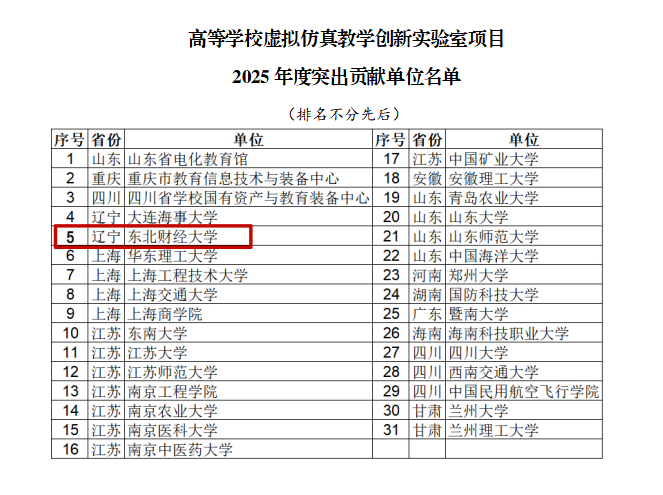 近日,教育部教育技术与资源发展中心(中央电化教育馆)公布了2025年度高等学校虚拟仿真教学创新实验室项目突出贡献单位和管理人员评选结果,全国共有31家单位和31名管理人员获评。东北财经大学获评突出贡献单位,这是学校首次获评此项荣誉。智慧校园建设中心姜明教授获评突出贡献管理人员。