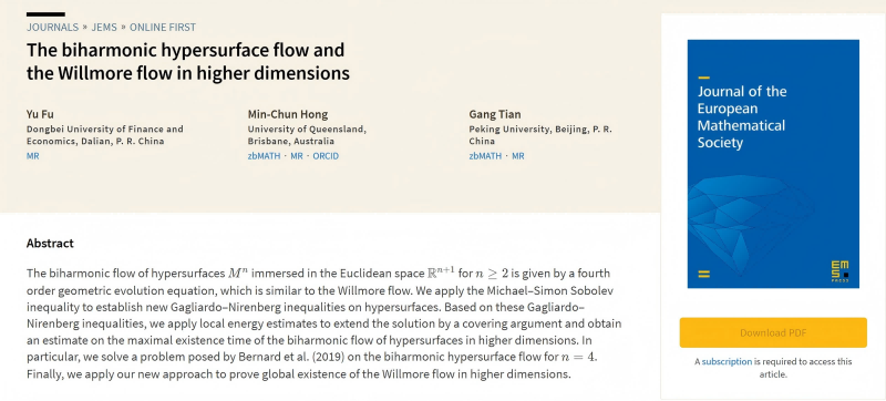 东北财经大学数据科学与人工智能学院富宇教授与北京大学国际数学研究中心田刚院士以及澳大利亚昆士兰大学洪敏纯教授合作,在国际综合类顶级数学期刊Journal of the European Mathematical Society(欧洲数学学会会刊)在线发表题为“The biharmonic hypersurface flow and the Willmore flow in higher dimensions”的学术论文。